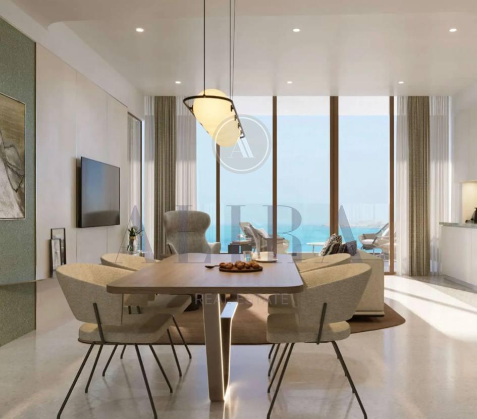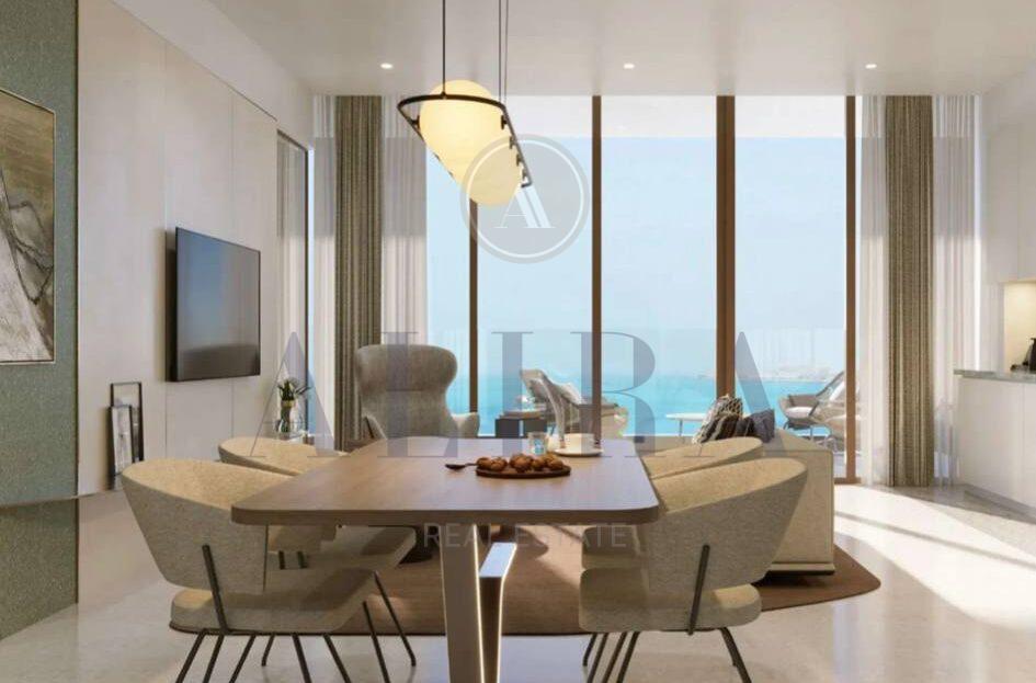 Inside, Palazzo Tissoli translates timeless craftsmanship into living form. Fully furnished studios and one-bedroom apartments reflect the balance between elegance and practicality — stone, wood, and glass form a warm, tactile palette, complemented by bespoke lighting and refined details. Floor-to-ceiling glazing dissolves the boundary between interior and exterior, framing the Arabian Gulf and the Wynn Resort as part of everyday life.